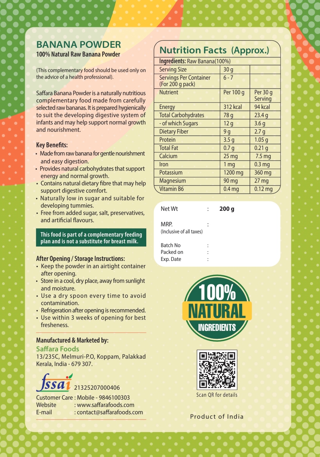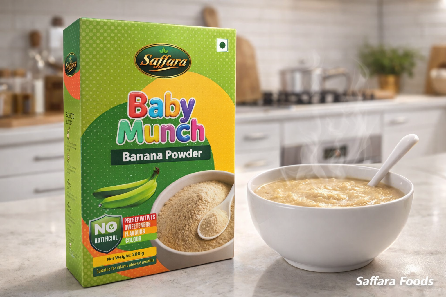 At Saffara Foods, we believe that baby food should be simple, clean, and transparent. Our banana powder is made without preservatives, additives, artificial colours, or flavours. Each batch is produced in small quantities to maintain freshness and consistency, ensuring parents can confidently include it as part of their baby’s daily diet.