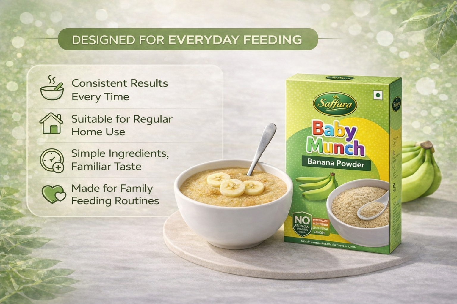 Saffara Banana Powder is finely milled to ensure it blends evenly with water or milk when cooked, resulting in a lump-free consistency. This makes it easier for babies to consume and helps parents prepare meals with confidence and consistency.