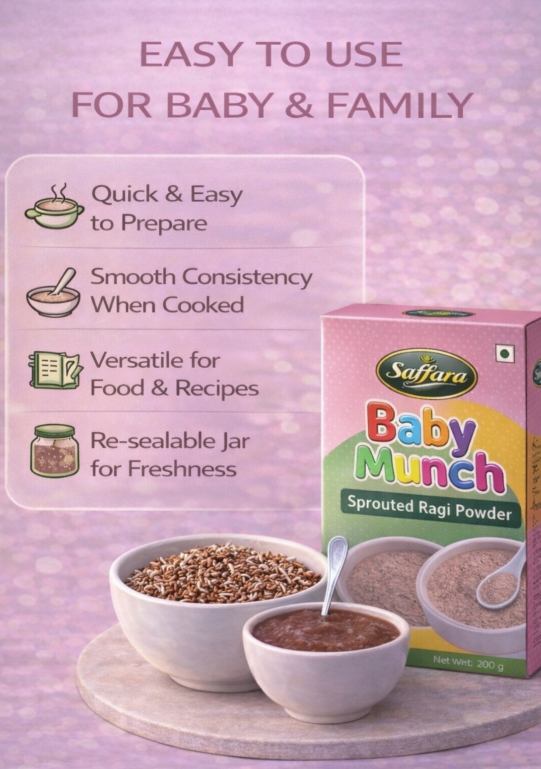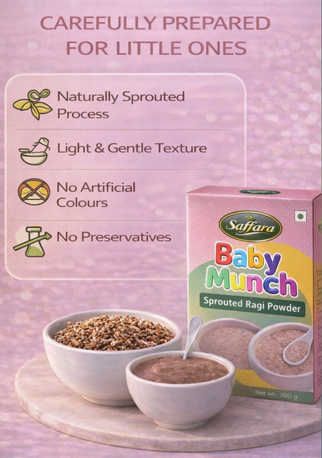 By avoiding unnecessary processing and additives, Saffara Sprouted Ragi Powder reflects a mindful and traditional approach to complementary baby food preparation.